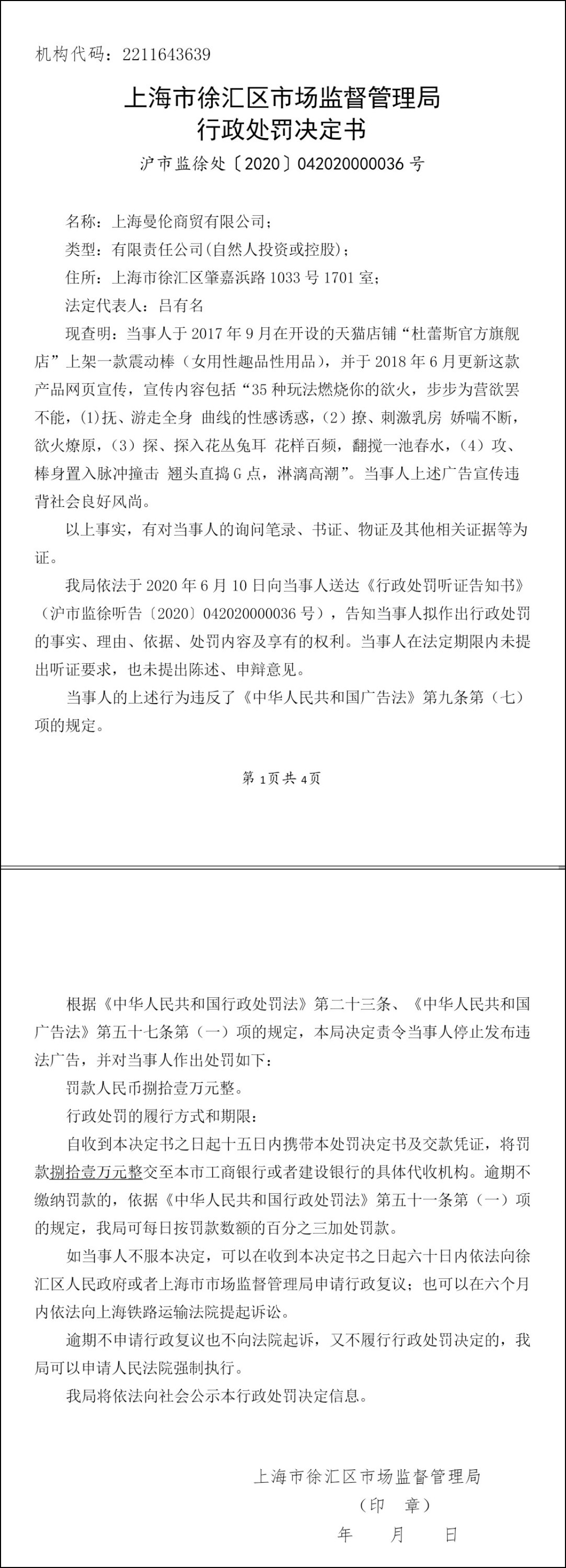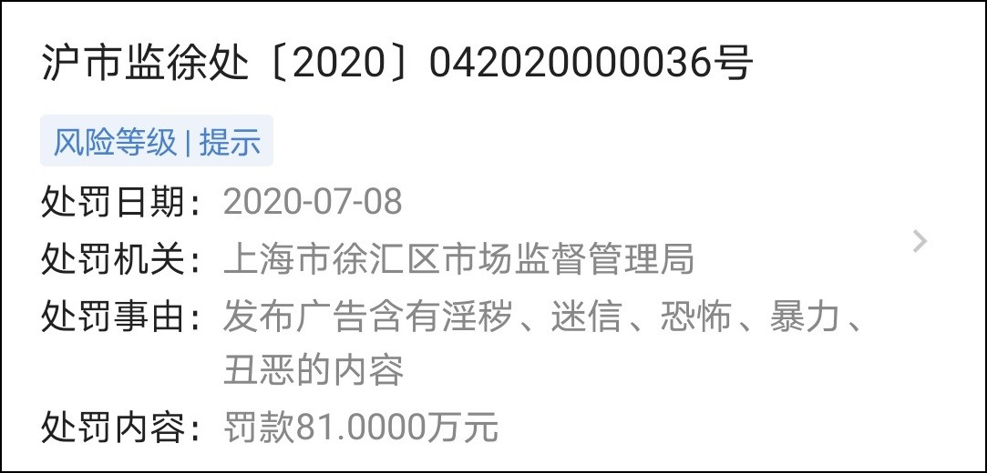 7月8日,上海曼倫接到上海市徐彙區市場監督管理局發出的行政處罰書,處罰金額達到81萬元,違法行為類型為發佈廣告含有淫穢、迷信、恐怖、暴力、醜惡的內容。