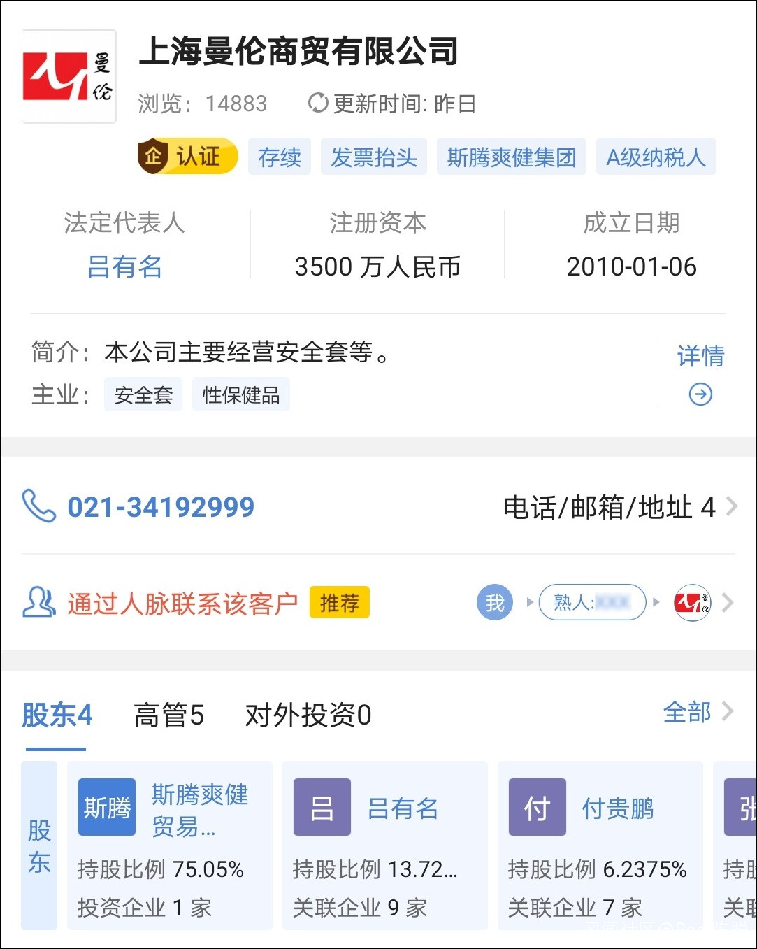 啓信寶信息顯示,上海曼倫商貿有限公司(下稱“上海曼倫”)成立於2010年1月,註冊資本達到3500萬元人民幣,由斯騰爽健貿易(上海)有限公司(下稱“斯騰爽健”)持股75.05%。