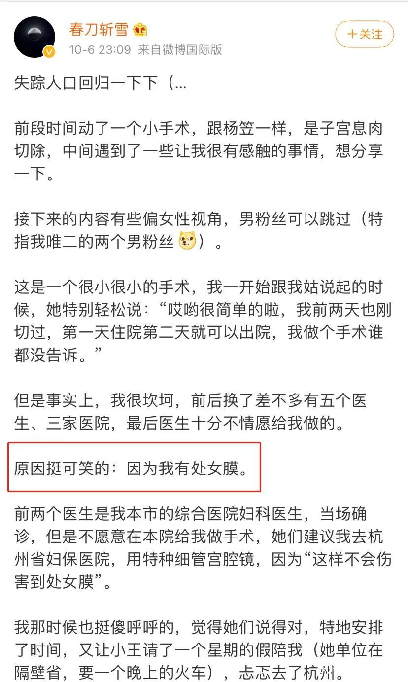 背後有一個讓博主覺得荒謬的原因: “因為我有處女膜。”醫生給她的解釋大概是:普通手術雖然簡單、便宜,但會破壞處女膜;微創手術又貴又麻煩,但能保證處女膜完整。而博主覺得不過是“一層閉環保護性人體組織”,卻如此麻煩的跑來跑去,還要簽字,實在令人費解,整個事情的來龍去脈曝光到網上後,數萬網友發表了自己的看法。以下是部分網友的留言: