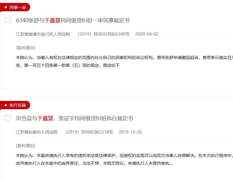不僅如此,有網友發現,中國裁判文書網上,有一個同名同姓,且同樣來自江蘇省南通市如東縣的95後“於鑫慧”被法院納入失信被執行人名單並限制其高消費。