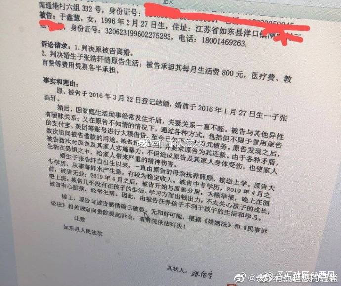 於此同時,另一個爆料中,張徵宇向如東縣人民法院提交了一份離婚協議,他指出,被告於鑫慧與其育有一子,2019年4月(當時還未離婚)後二人分居,並大額借債,對孩子也一直不管不顧,因此請求離婚。