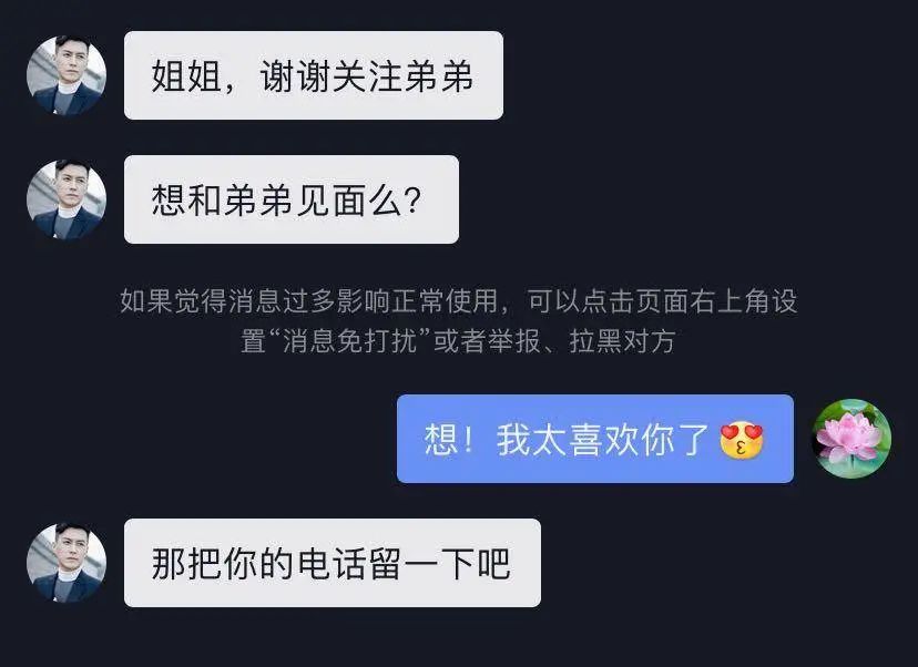 本以為關注了之後,起碼要等院辦點贊評論混個眼熟,才能跟假靳東們(以下文章中稱“假東東”)交手。沒想到線還沒放下去,魚就上鈎了。