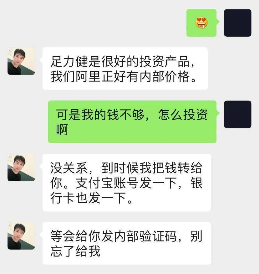 騙子又告訴我支付寶內部有活動,可以讓院辦用內部價格批發某力健。讓我把賬號和卡號告訴他,等會驗證碼也發給他。