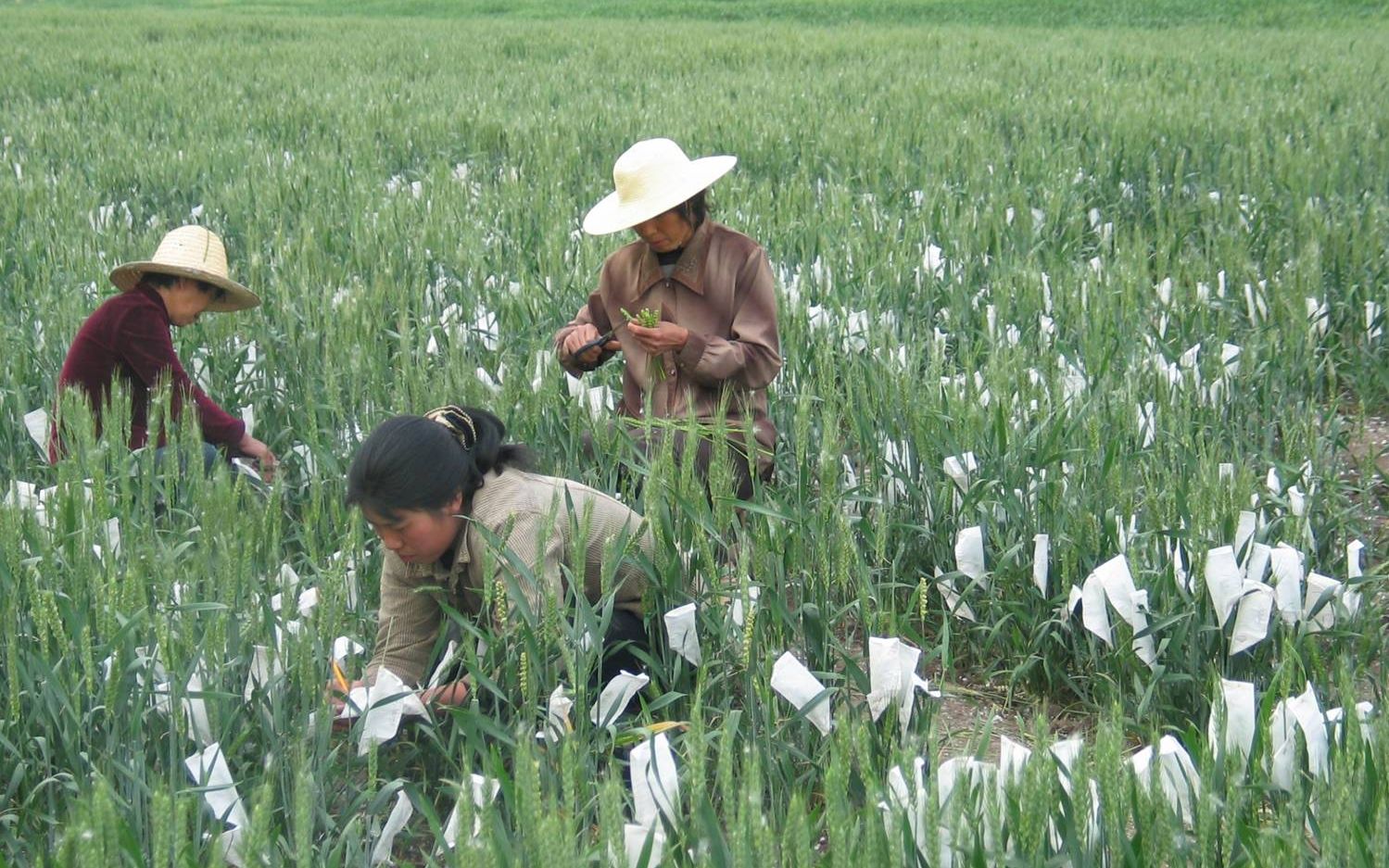 工作人員在麥田中選出矮杆、不育的矮敗小麥,進行人工授粉。中國農科院供圖