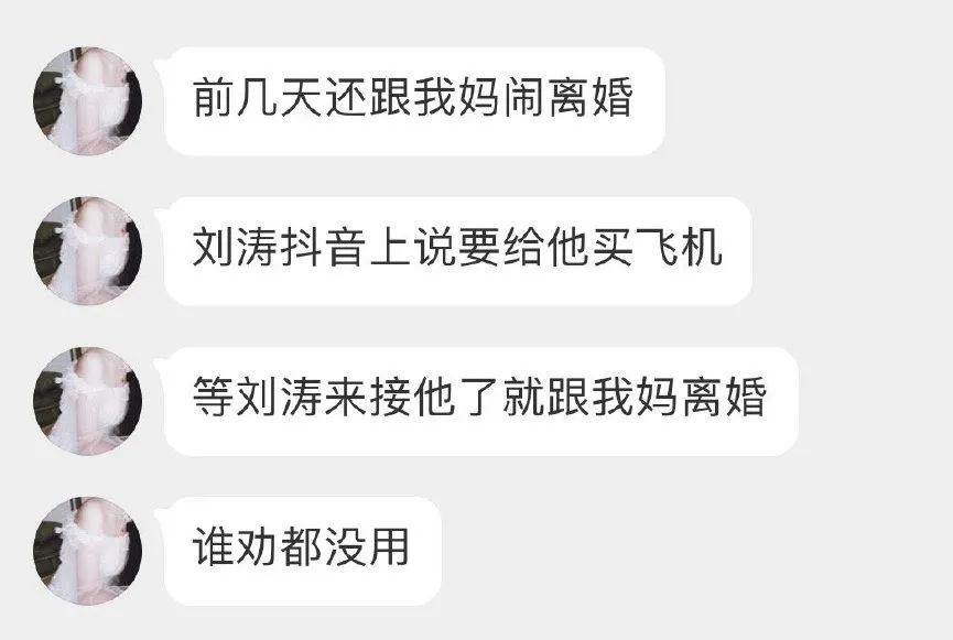 有網友爆料,他們的爸媽已經鬧到要離婚的地步了,理由是劉濤要給他爸買飛機,等劉濤來接他爸就要離婚,誰勸都沒用。