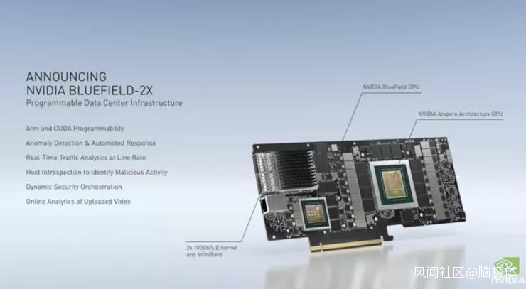 而BlueField-2X DPU則擁有包括BlueField-2 DPU的所有關鍵特性,其特性能夠通過英偉達安培GPU的AI功能得以增強。而在英偉達的路線圖裏,未來的Bluefield-4 將會引入CUDA 和 NVIDIA AI,極大加快網絡中計算機視覺應用處理的速度。