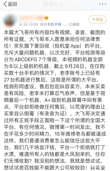 而除了惡意壓價外,在投訴平台和社交平台上,關於愛回收旗下3C交易平台拍機堂“貨不對板”、“以次充好”的投訴也比比皆是。