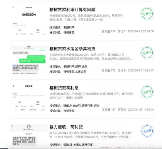 其中,在新浪黑貓投訴上,榕樹貸款投訴帖913個,涉及高利貸、砍頭息、強制下款等投訴。