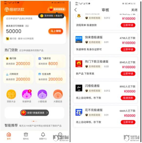 上述投訴人提供的截圖顯示,榕樹貸款向其推薦的借款平台有多個,包括快來借極速版、熱門下款王極速版、閃藉藉宿版、花不完極速版、飛鑫瓊寶、閃零易貸、任意消費等等。