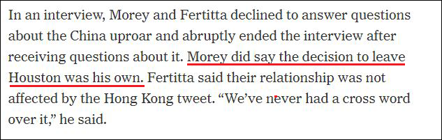 不管是火箭隊老闆費爾蒂塔,還是莫雷本人,都表示辭職一事與不當言論無關。