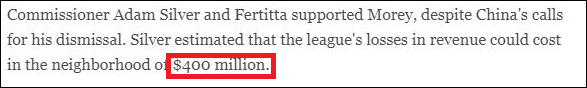 “(因為莫雷的爭議言論)NBA離開了擁有14億人口的中國……然而莫雷卻從未被解僱、停職,或者道歉以保留職務。”