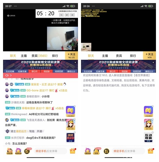 但是這並不妨礙其它平台進行“另類直播”。近日,企鵝電競平台就出現獨有的 “黑屏解説”直播來搶奪流量,直播間雖然沒有遊戲畫面和聲音,但是仍然可以主播一起 “黑屏聊比賽”。而想觀看遊戲畫面和聲音的用户可自行雙開瀏覽器,實現收看官方比賽畫面的同時,聽主播 “聊比賽”。