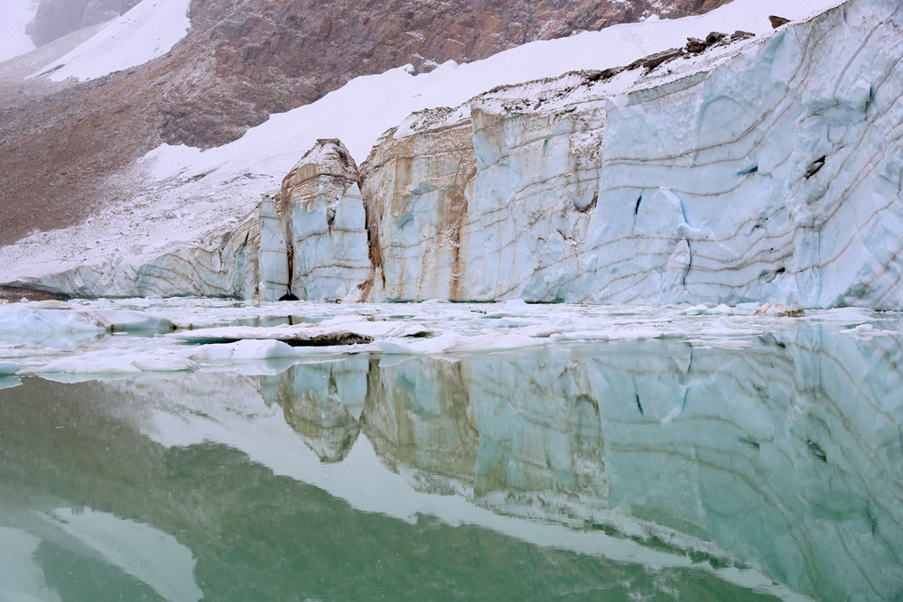 Edith Cavell冰川是落基山裏少見的直接接上湖水的冰川,冰川斷面清晰可見。這裏在陡坡下,右手的陡坡上不時傳來爆炸一般爆裂身,那是冰川的冰塊融化斷裂的聲音。現在不怕,等掉下來的時候都粉碎了;冬天大雪的時候就不妙了,這聲音是雪崩的前兆