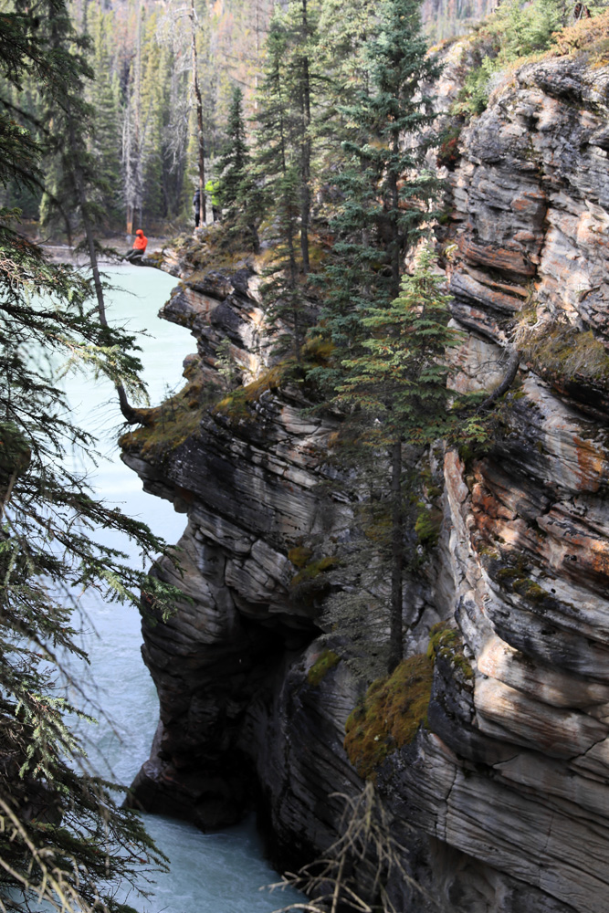 Jasper的Maligne峽谷不寬,但很深,而且不長的距離就有很大的落差,峯迴路轉,翠綠的冰川融水流淌其間,挺好看