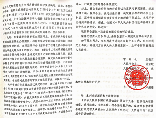 2020年3月20日,杭州市中級法院作出行政判決書認可了省政府行政複議決定書撤銷省發改委處理意見的結論,同時在本院認為部分糾正和否定了省發改委認為一路公司業績無效的認定。