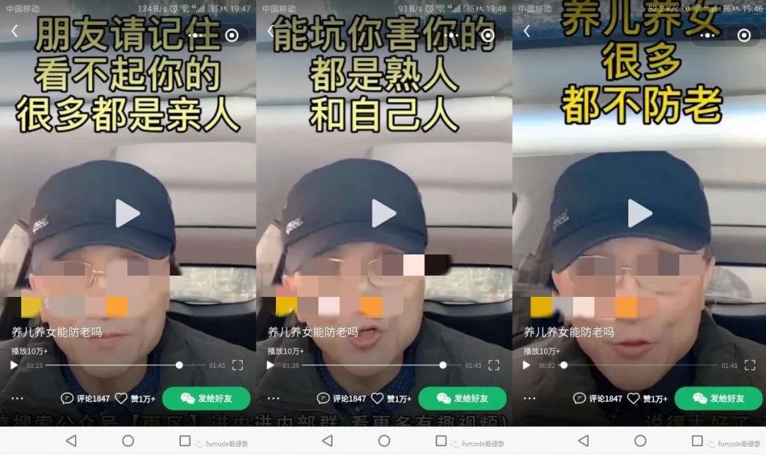 據一位網友敍述,抖音近來經常給他媽媽推送一些養兒防老、孩子不孝、孩子一味順從的“孝順”視頻。她挨個點贊,挨個下載,還經常發給自己看。他吐槽道,“我就只是想要正正經經的坐下來和我媽講個道理,在她眼裏就是我不孝順了,就是我讀的書都白讀了?”