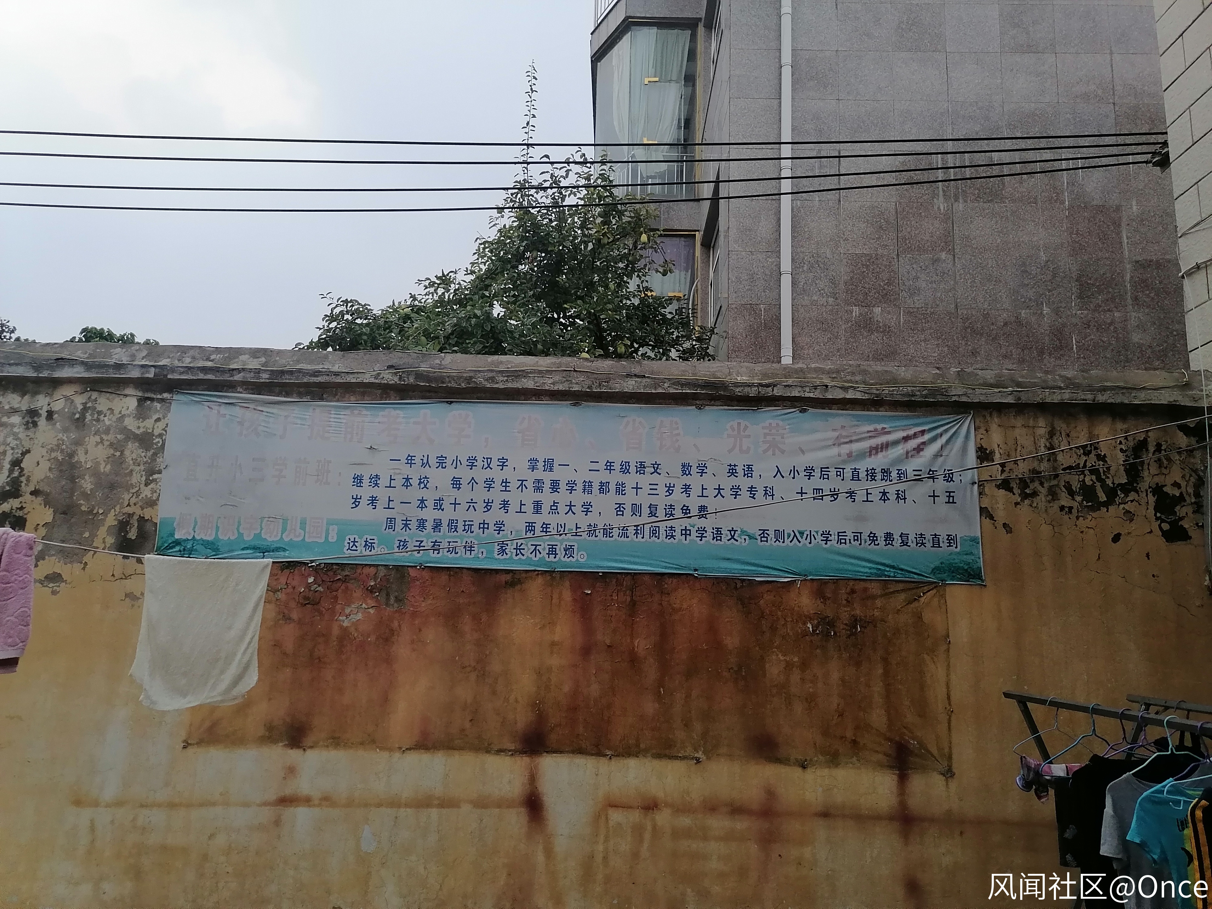 “聖童家學”的院牆上有一幅廣告:“十六歲考上重點本科,否則復讀免費”。看上去張掛了很久。