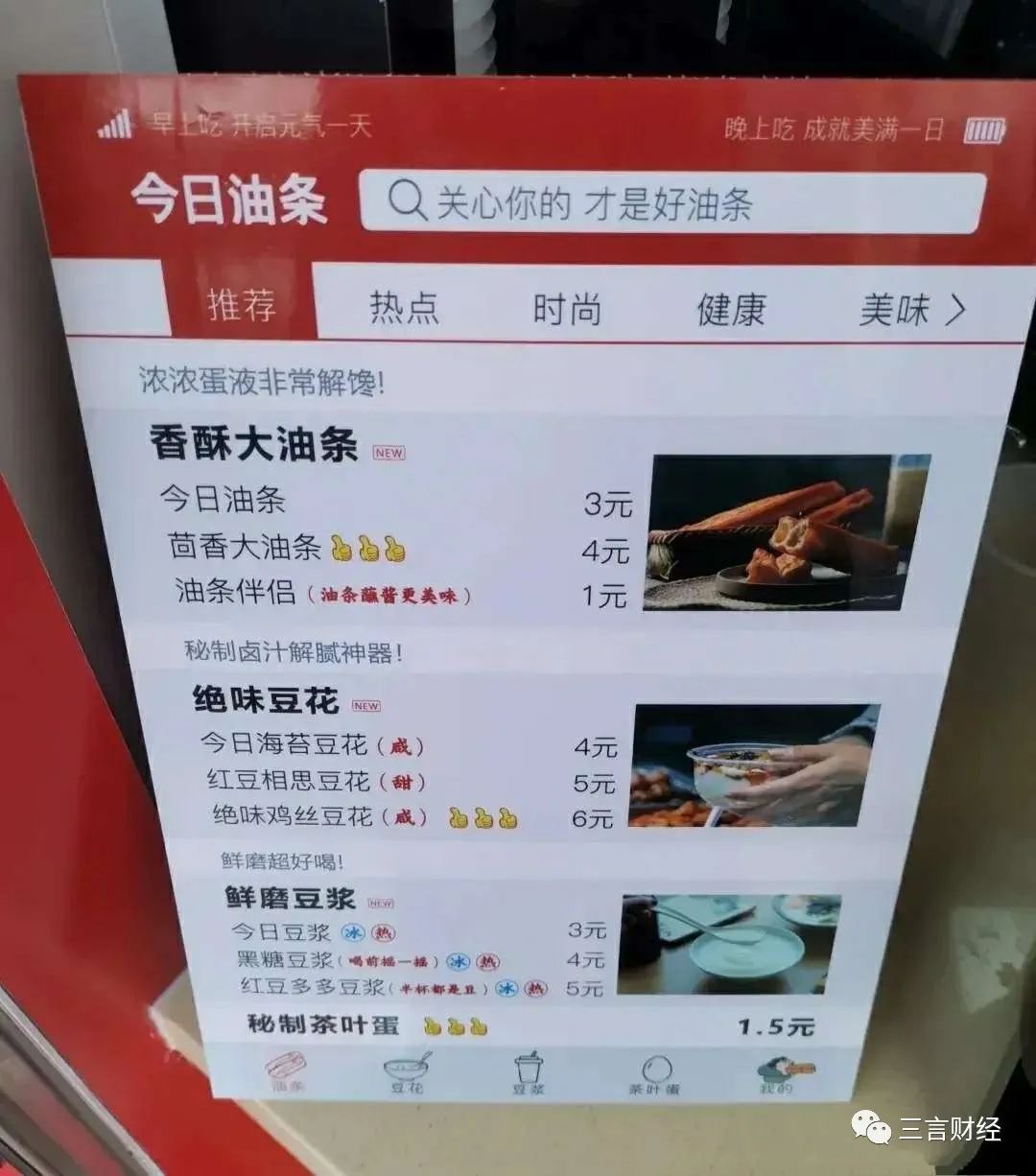 顧名思義,“今日油條”是一家售賣油條等飲食的店鋪。但三言財經注意到,根據網友們拍攝的照片顯示,相較於普通的路邊攤,“今日油條”門店風格要“高大上”很多,有些類似西式快餐店的味道。