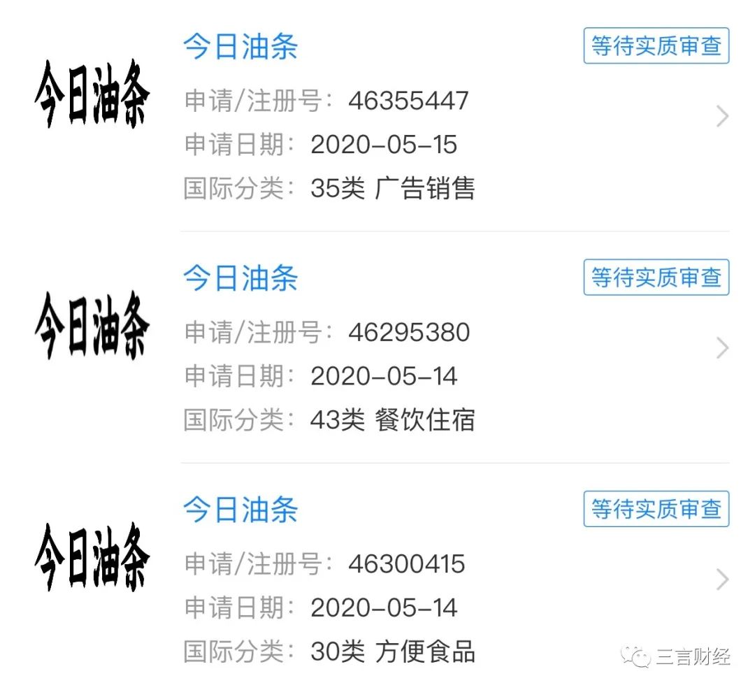 三言財經調查發現,“今日油條”這個商標屬於河南今日油條餐飲管理有限公司,該公司以“今日油條”名稱申請註冊第35類廣告銷售、第43類餐飲住宿和第30類方便食品共三種商標。目前,這三類商標狀態均為“等待實質性審查”。