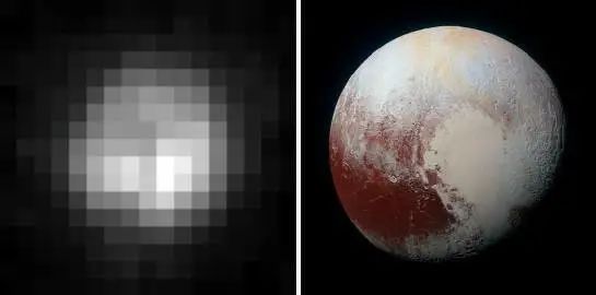 左圖,1994年哈勃拍攝到的冥王星。右圖,2015年7月14日新視野號拍攝到的冥王星。圖源:Wonder of Science。