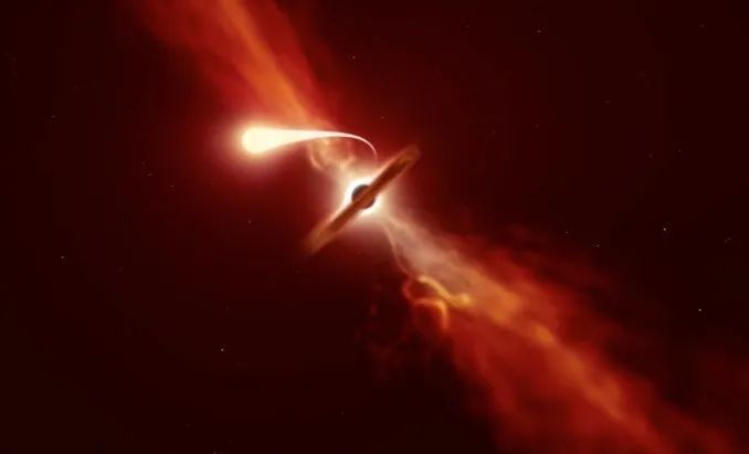 該藝術渲染圖描繪了一顆恆星被吸入到一個巨型黑洞中的過程,其大氣層被黑洞撕裂成稀薄的物質流,經歷了“意大利麪條化”。圖片來源:ESO / M. Kornmesser