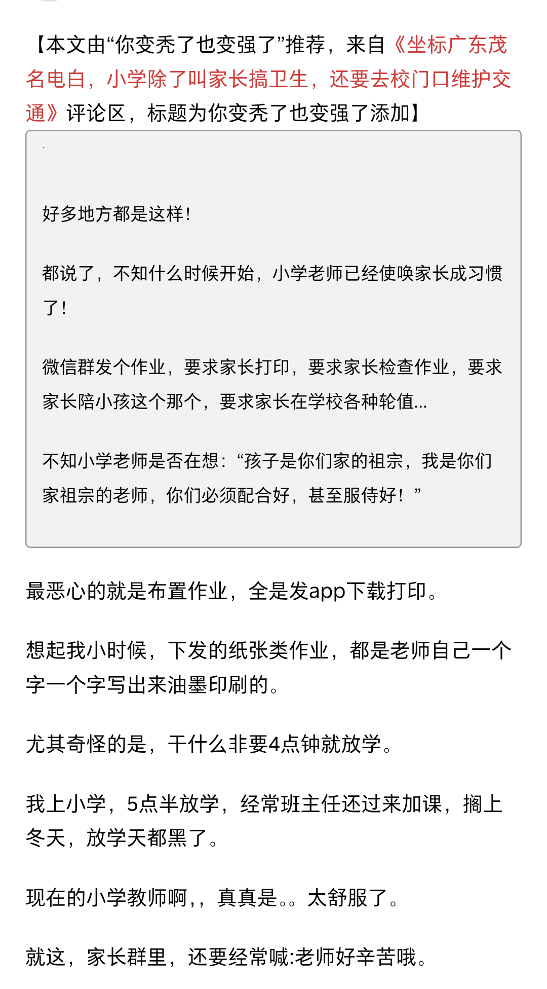 回家依然會有很多學生工作,要知道很多班主任自己也有孩子。都是家長還是互相體諒吧。