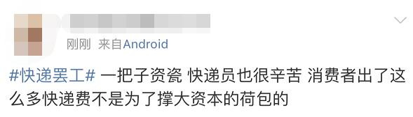 在微博的話題裏,吐槽抱怨的同時,大部分網友們對快遞員罷工的行為表示支持。