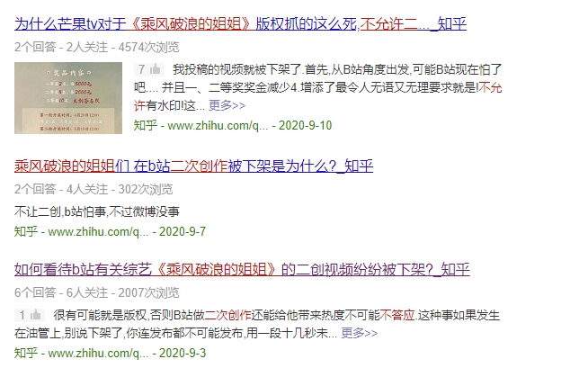 芒果TV前段時間大火的節目是《乘風破浪的姐姐》,芒果TV可把版權抓得死死的,在播出期間嚴格限制了B站UP主的二次創作(當然,播出後的現在放鬆了)。