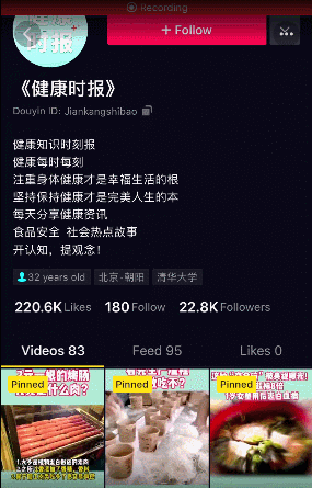 類似的還有劉濤、羅晉等等明星,仿冒賬號數不勝數,就連媒體都有仿冒賬號。目前國內覆蓋面、公信力和影響力較大的《健康時報》,抖音上同名的就有12個。