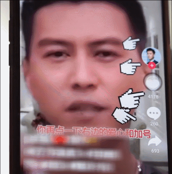 接下來,打開任意視頻,你都能看到一個不知道什麼電視劇裏扒下來的西裝靳東,在各種愛心、泡泡、小星星特效的襯托下,在瀑布下、大海上、彩雲間、花叢裏,操着口型都對不上的東北話、河南話、蹩腳普通話呼喚着: