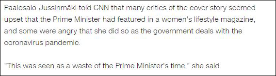 一些網友表示,這“有失總理的公信力”,況且此時她應該專注於疫情防控,而不是登上時尚雜誌封面。此外,芬蘭國內的一些政客和企業家還對其進行了人身攻擊。