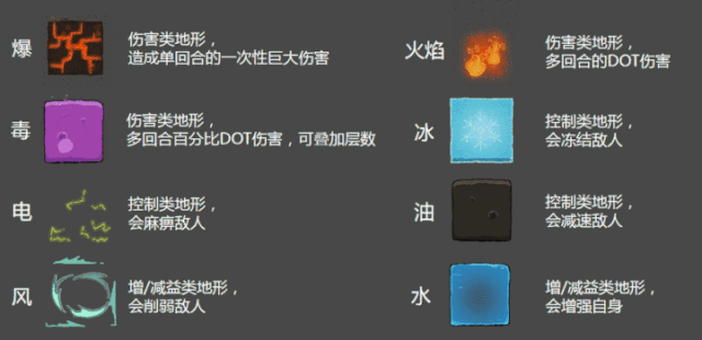 這個“地表元素格”的概念,是在關卡中加入了一些可能導致元素變化的固定物件,玩家和怪物的技能也可以造成地表元素的改變。比如,如果毒系技能觸碰到水錶面,就會把那個格子變成踩上去會持續掉血的毒液池。