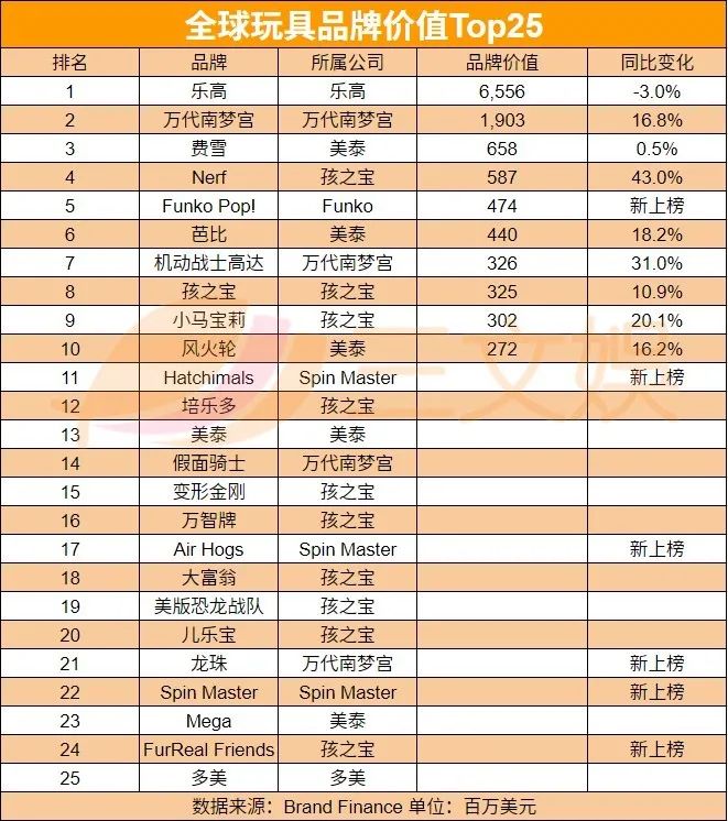 全球玩具品牌Top25:樂高萬代費雪位列前三,IP重要性越來越大_風聞