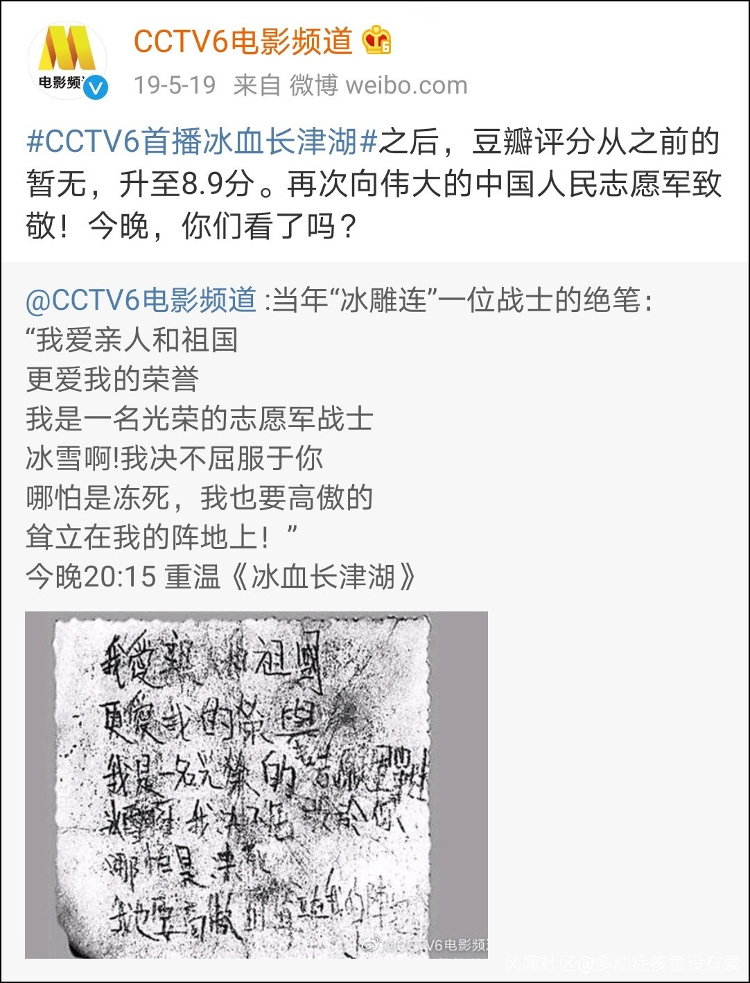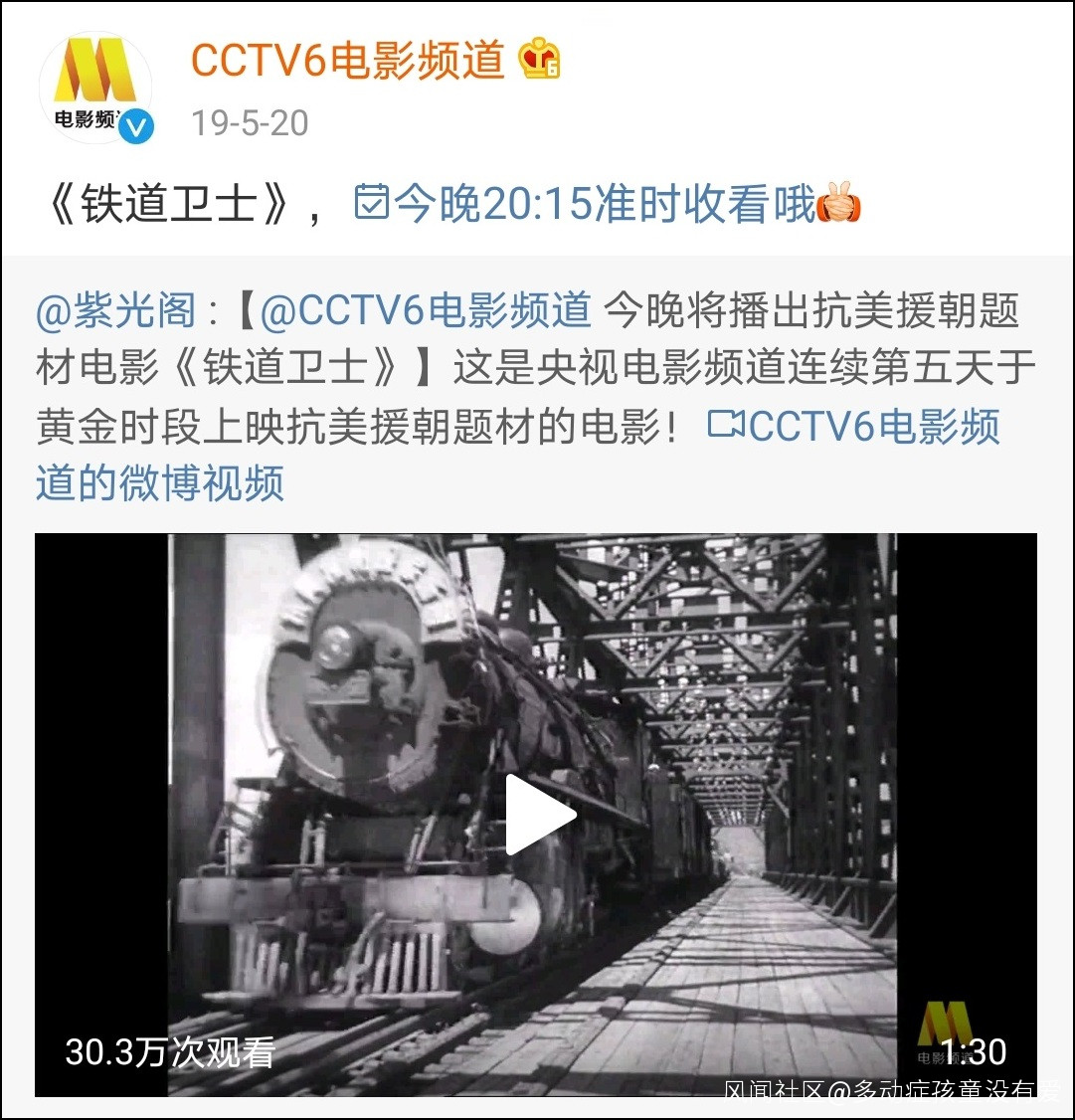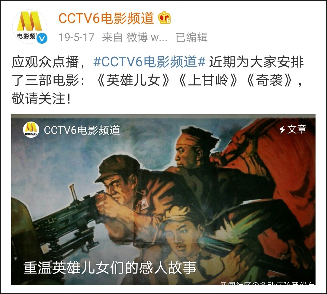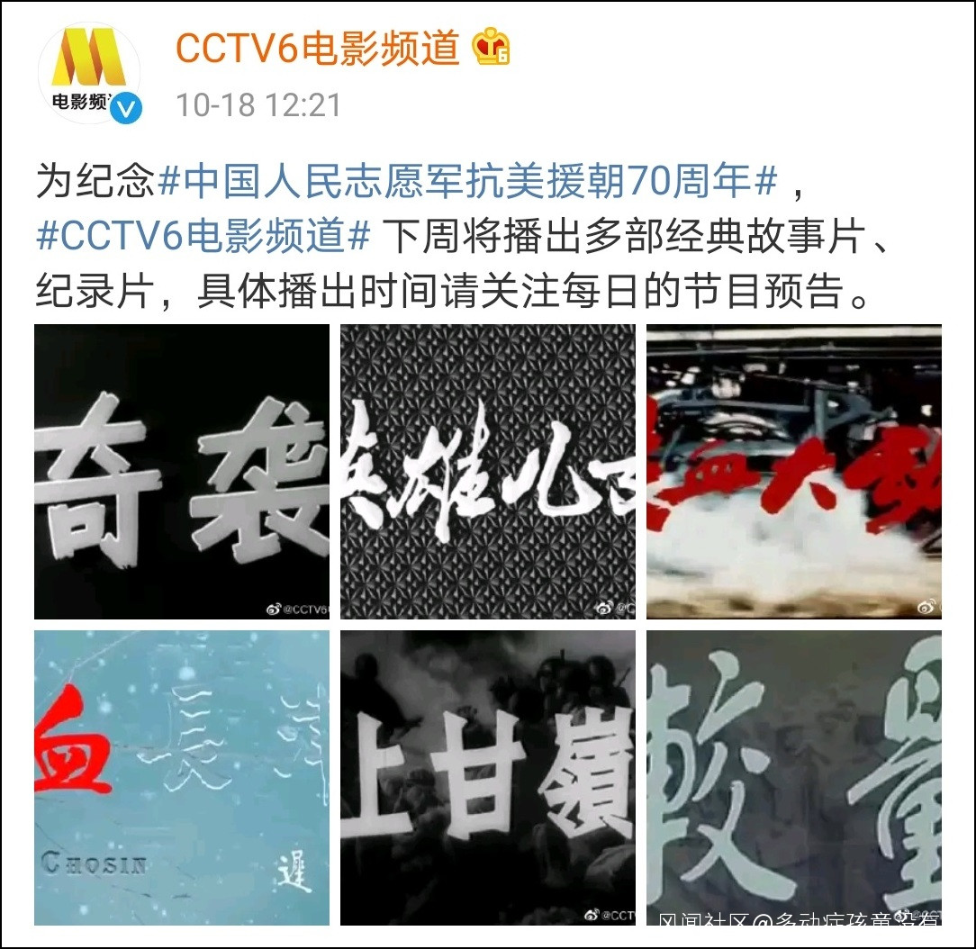 @CCTV6電影頻道 微博18日消息,為紀念中國人民志願軍抗美援朝70週年,電影頻道下週將播出多部經典故事片、紀錄片,具體播出時間待定。根據配圖,這些待播的抗美援朝題材作品包括《奇襲》《英雄兒女》《鐵血大動脈》《冰血長津湖》《上甘嶺》《較量》等。