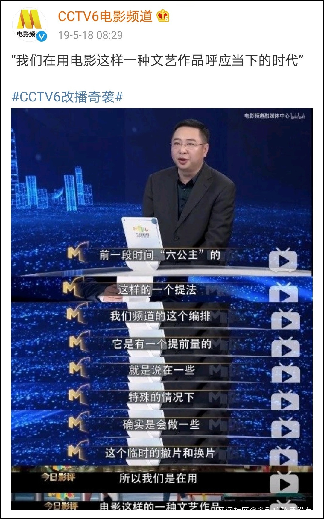 連續多次因為臨時編排播出充滿正能量、鼓舞人心的主旋律影片而引發網友熱議後,電影頻道總編室主任董瑞峯也曾給出回應:“頻道的安排,在一些的特殊情況下,確實會做一些臨時的撤片和換片,所以我們是在用電影這樣一種文藝作品,在呼應當下的時代。”
