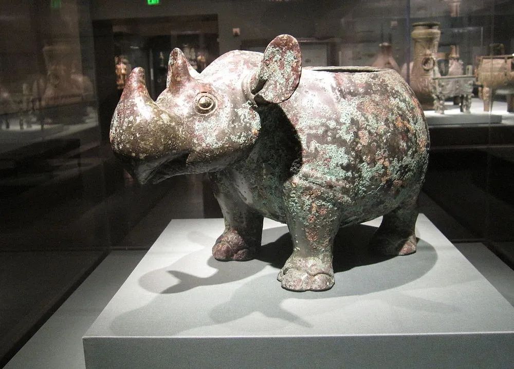 清代道光年間,山東出土了7件青銅器,其中一件被稱為“小臣艅(yú)犀尊”,鑄造於商晚期。它塑造了一頭敦厚肥壯的犀牛,更值得注意的是,這是一頭雙角犀牛。
