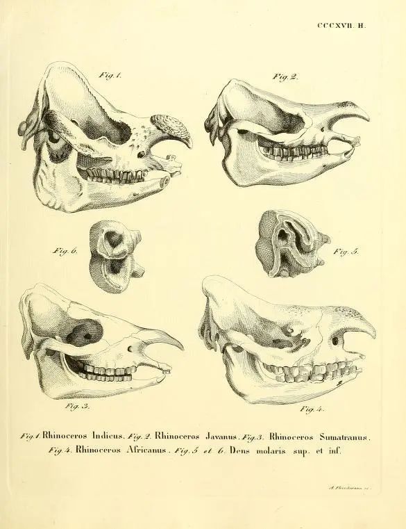 犀牛頭骨,左下為蘇門答臘犀。圖片:Biodiversity Heritage Library / Flickr