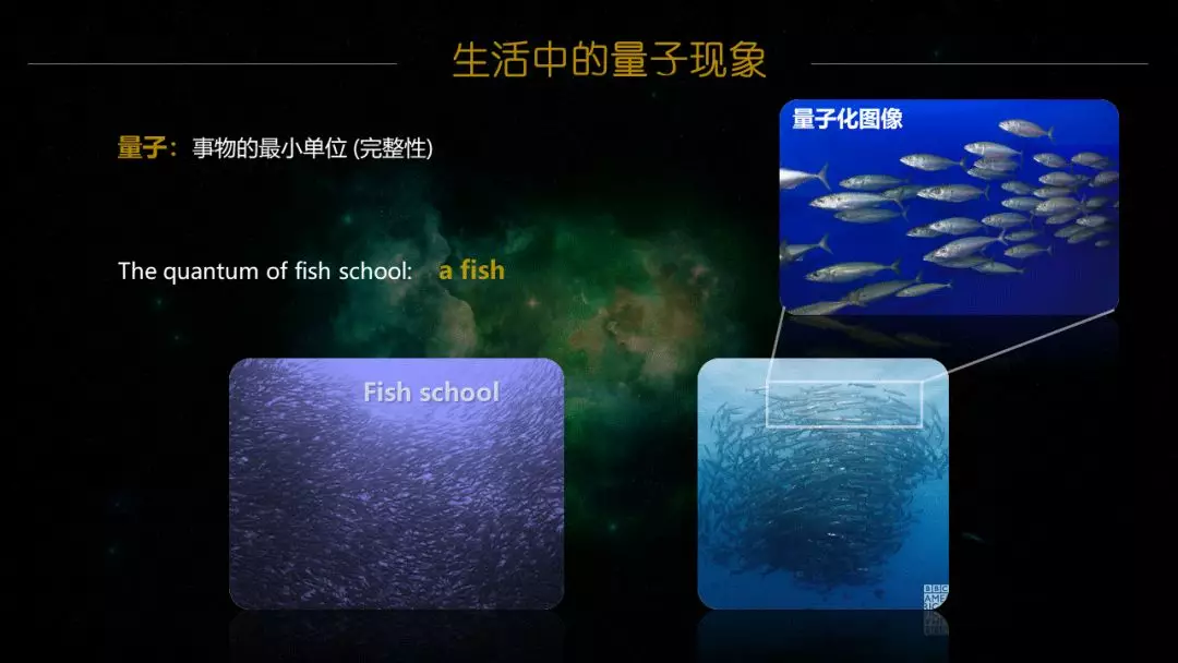 曹則賢老師比喻得很好,我們生活中的可以見到的感知到的事物,包括光和能量的最小單位都能稱之為量子。就像我們遠處看魚羣是烏央烏央的一片黑,但是放大了看就是一隻一隻的魚,這就可以説是魚羣的量子。