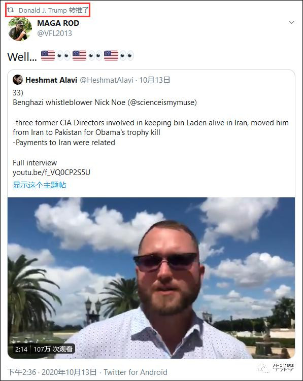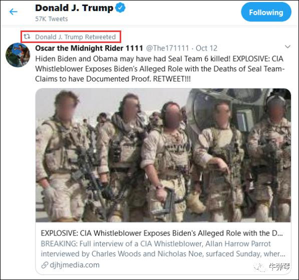 10 月 13 日,特朗普連發轉兩條推特。第一條,上面還有美國海豹突擊隊的照片,裏面的大致內容是:本 · 拉登還活着,當年被美國擊斃的,只是他的一個替身,當時的總統奧巴馬和副總統拜登都牽涉其中,還因此殺第六海豹突擊隊員滅口。