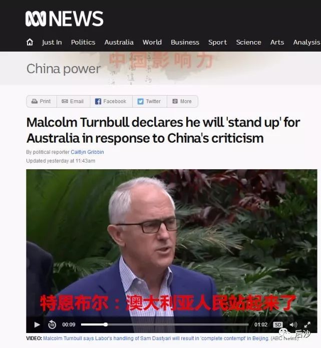 前總理特恩布爾強硬表示,不認同中方的批評,還特意用普通話和英語引肜“中國人民站起來了!”這句話説::“澳大利亞人民站起來了!”