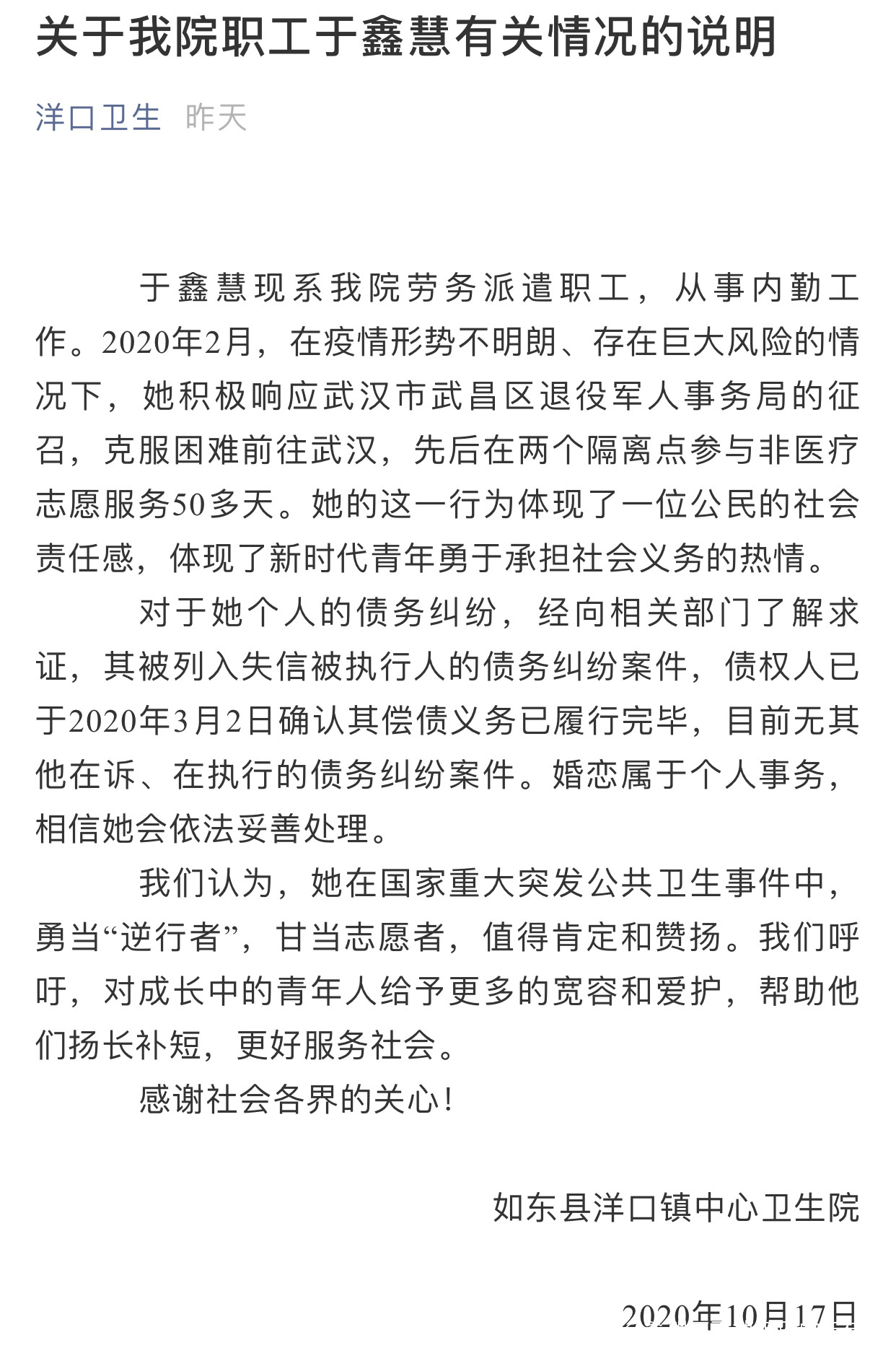 10月17日晚,於鑫慧所在單位,江蘇省南通市如東縣洋口鎮中心衞生院通過官方微信號“洋口衞生”對此事發布情況聲明。