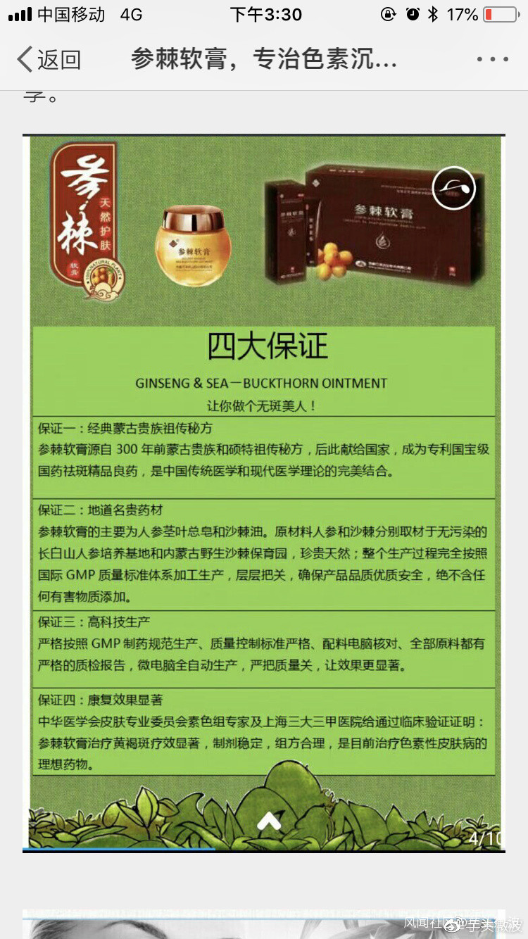 那麼我們看看,譚老闆在被刑拘前的他的美篇是怎麼説他打廣告和銷售的“參棘軟膏”的[2]: