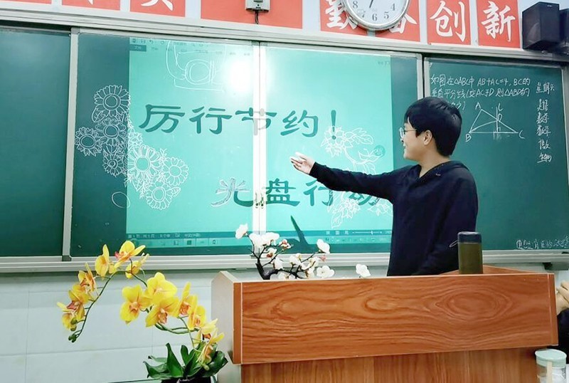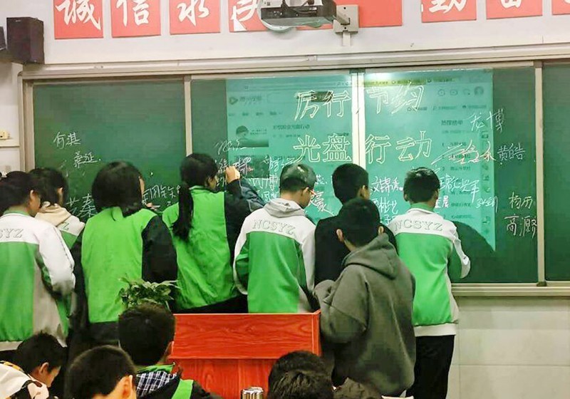 班會最後,各班同學起立宣誓,還有些班級的同學,把黑板變成了簽名牆,紛紛走上講台,莊嚴簽上自己的名字,表達了自己在今後的生活中將身體力行、厲行節約、反對餐飲浪費的決心。