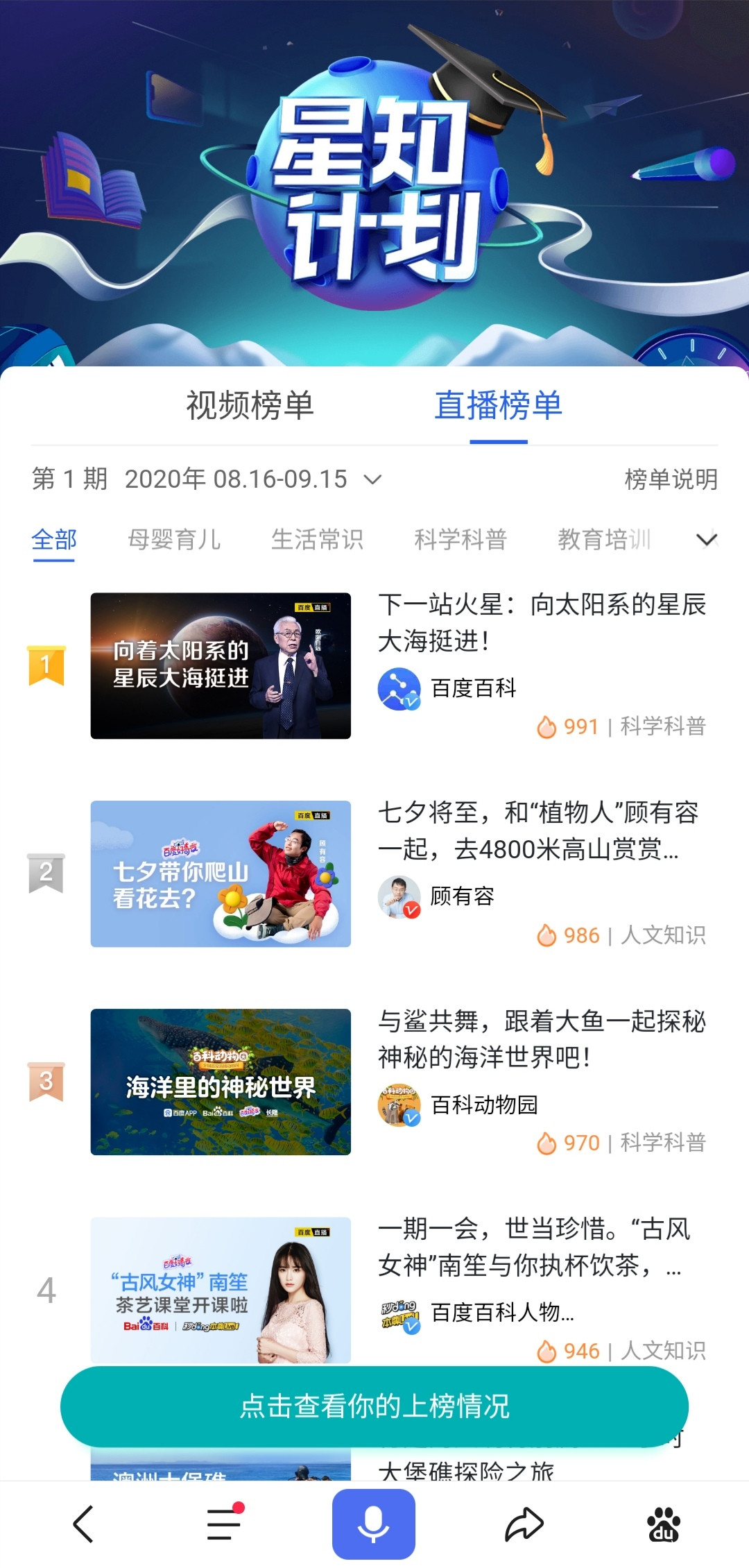 當前百度“星知計劃2.0”又從流量扶持、現金獎勵、粉絲賦能等角度建立了完善的知識視頻創作者激勵機制,“星知直播榜”打造了全網首個權威知識類內容直播榜單等。