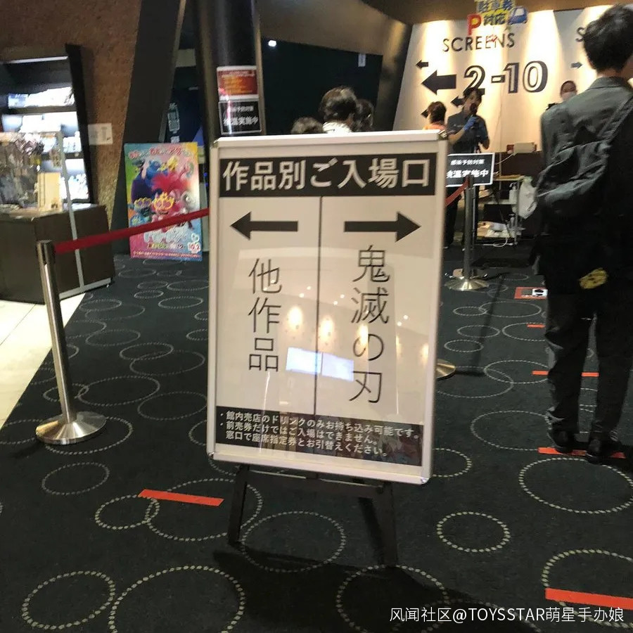 有些影院更是全線主打《鬼滅之刃》劇場版,就連佈置海報都僅有《鬼滅之刃》,甚至劃分了觀眾通道(看《鬼滅之刃》和不看的隊列)
