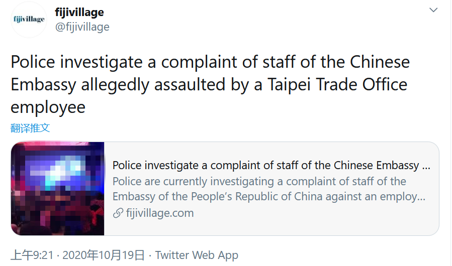 台媒“中央社”19日援引外媒《亞太報告》Asia Pacific Report報道,稱10月8日晚,台北駐斐濟商務辦事處在斐濟首都蘇瓦一家酒店內舉辦所謂的“雙十國慶酒會”。有兩名大陸外交人員“闖入不願離開”,還對台方人員“大打出手”,將其中一人“打成腦震盪住院”。