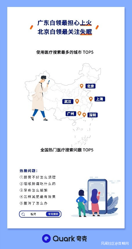 同時,地域和文化差異也帶來了不同地區不同的醫療健康關注點。夸克搜索中,廣州、深圳、上海、北京、武漢等城市的白領人羣使用醫療搜索熱情最高。