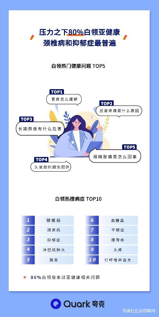 久坐不動,飲食隨意,用眼過度,造成頸椎病、腸胃病、乾眼症、腰背疼等症狀,成了年輕白領一族的標配,80%白領在夸克搜索過亞健康相關病症。與之相應,胃疼怎麼緩解?後背疼痛是什麼原因?長期熬夜有什麼危害?久坐如何避免肥胖?是白領們的熱搜問題。