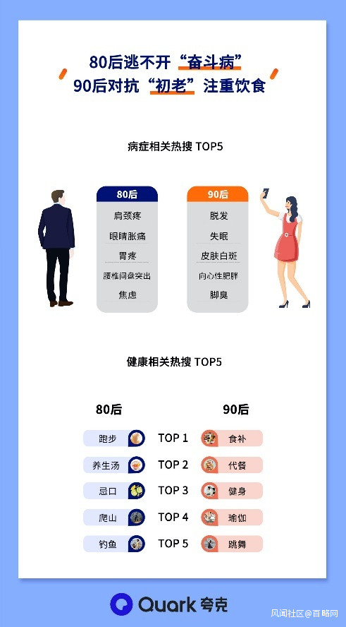 996常態加班,刷手機慣性熬夜,數字時代的快節奏,白領人羣的健康問題頻頻報警。近日,智能搜索app夸克發佈“白領健康數據報告”顯示,80%的白領人羣關注亞健康問題,90後開始花式養生,80後愛跑步對抗中年焦慮。