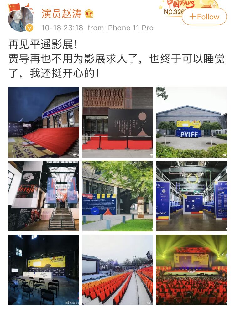 10月18日晚,著名女演員、賈樟柯導演的夫人@趙濤 也在微博發文告別平遙國際電影展,“再見平遙影展!賈導再也不用為影展求人了,也終於可以睡覺了,我還挺開心的。”
